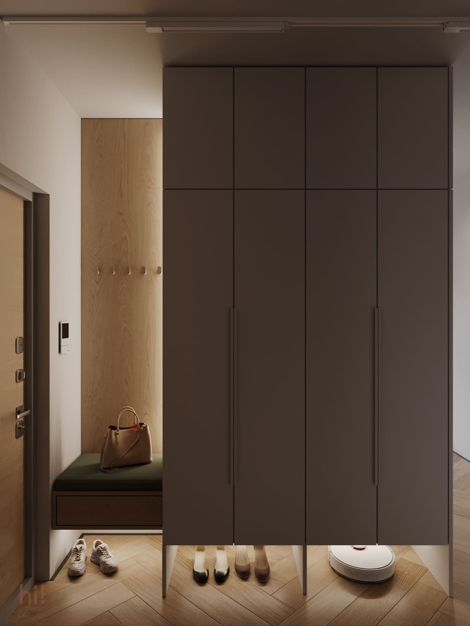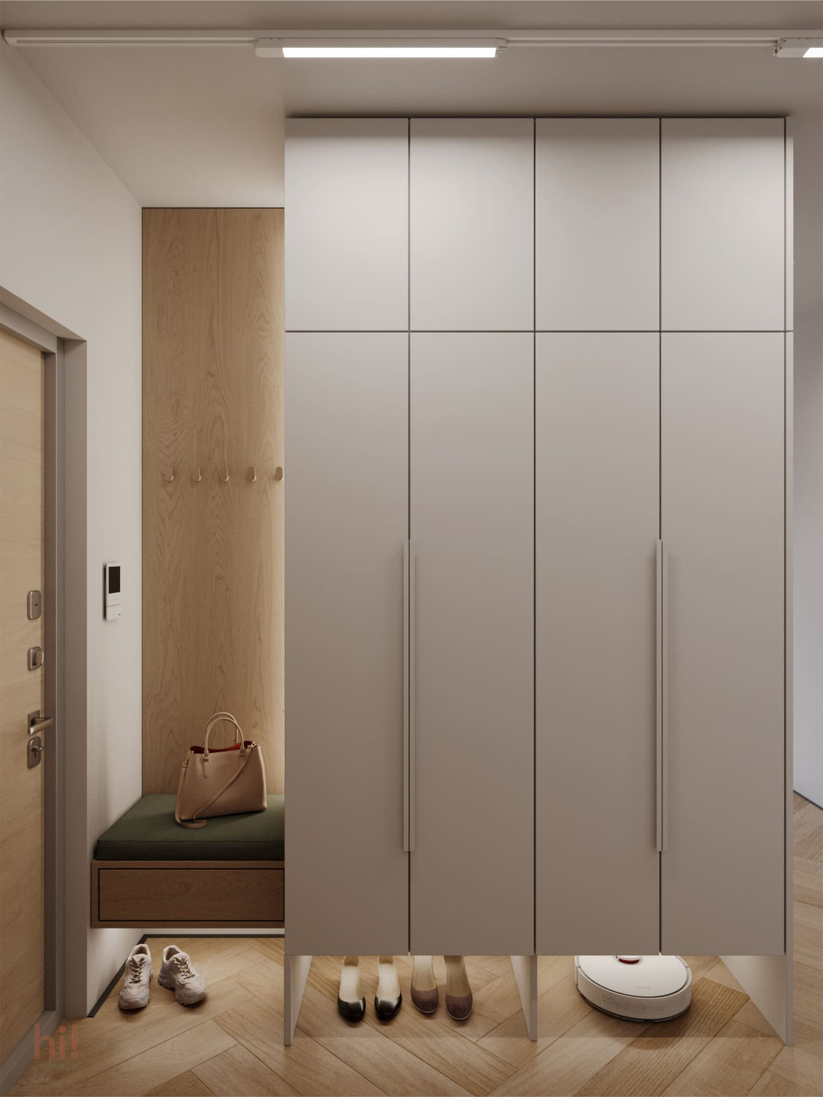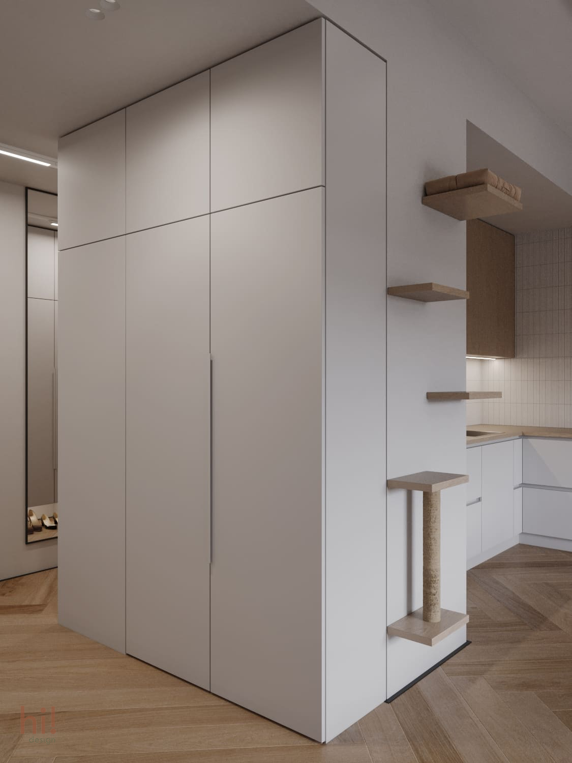 Светлая квартира в современном стиле, для семьи с удаленной работой обоих родителей, а значит красивыми, интегрированными в общий интерьер, рабочими местами. Интересное решение получилось с «парящими» гардеробами в Холле, они огибают очень массивный инженерный короб, скрывают его и обеспечивают вместительное хранение для всех нужд. Про кошку также не забыли)