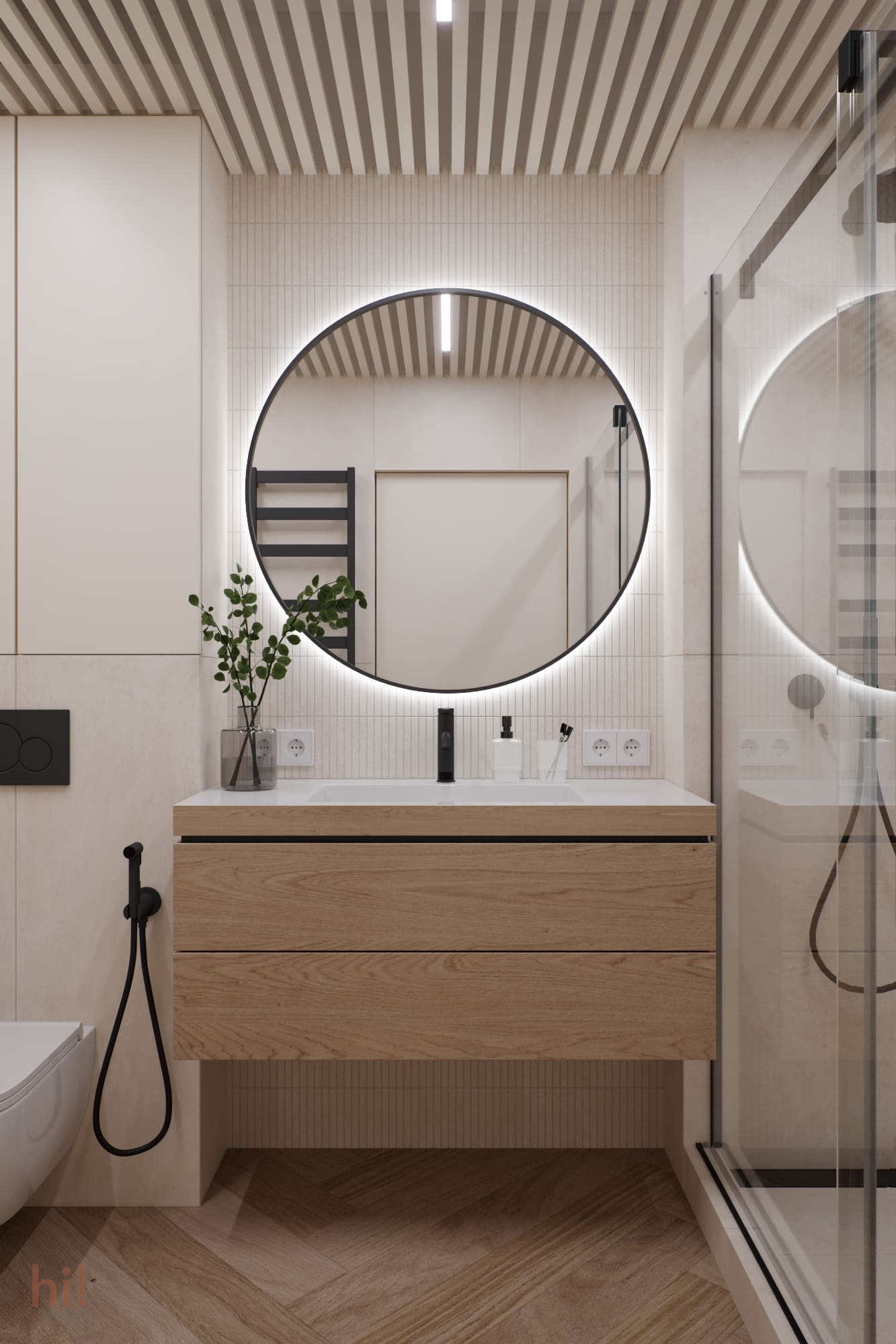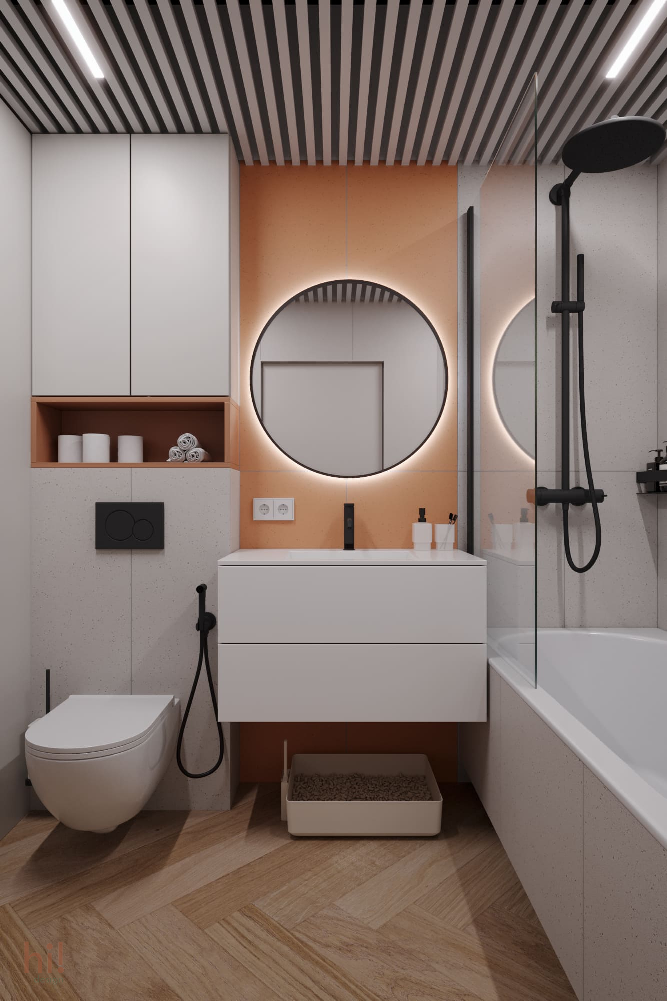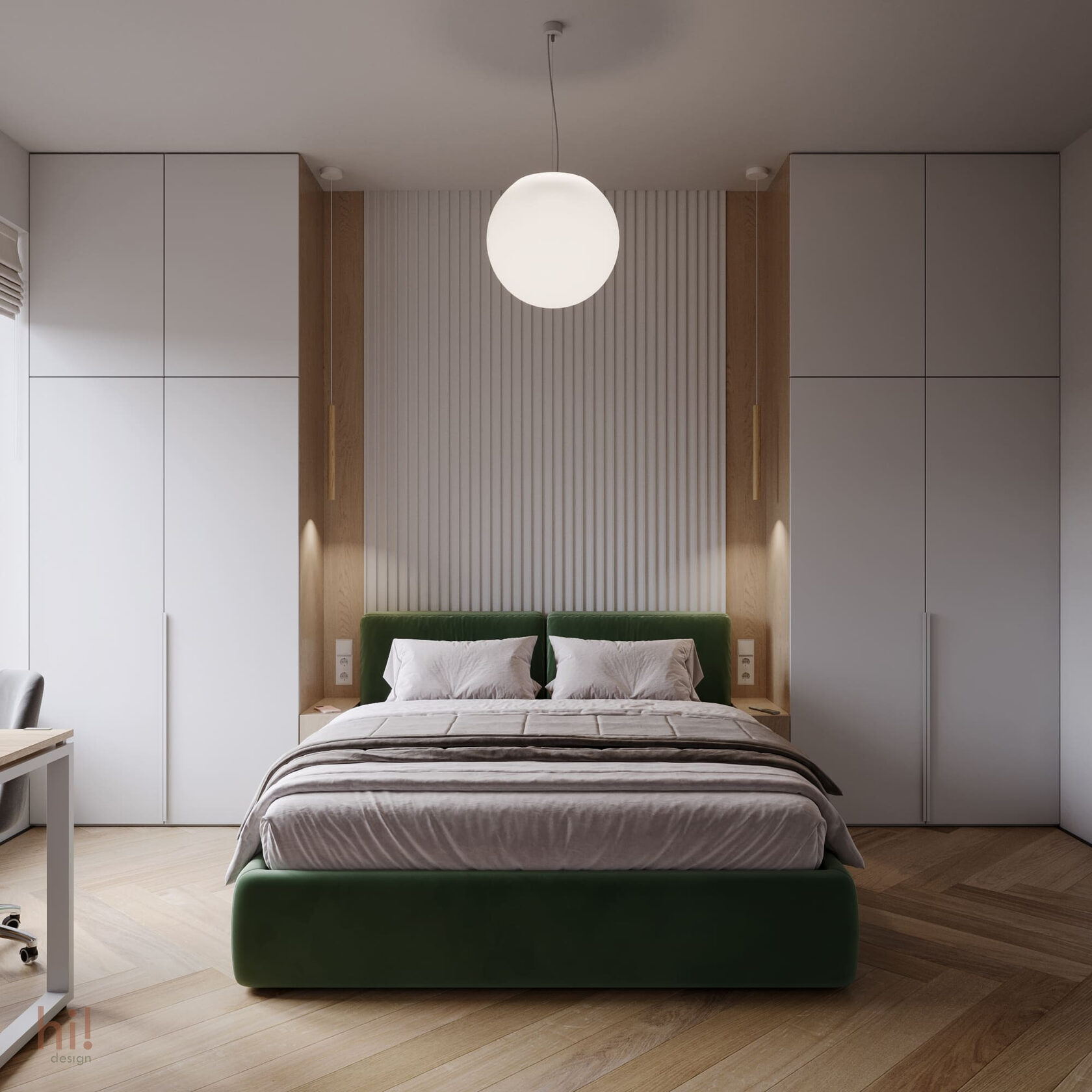 Светлая квартира в современном стиле, для семьи с удаленной работой обоих родителей, а значит красивыми, интегрированными в общий интерьер, рабочими местами. Интересное решение получилось с «парящими» гардеробами в Холле, они огибают очень массивный инженерный короб, скрывают его и обеспечивают вместительное хранение для всех нужд. Про кошку также не забыли)