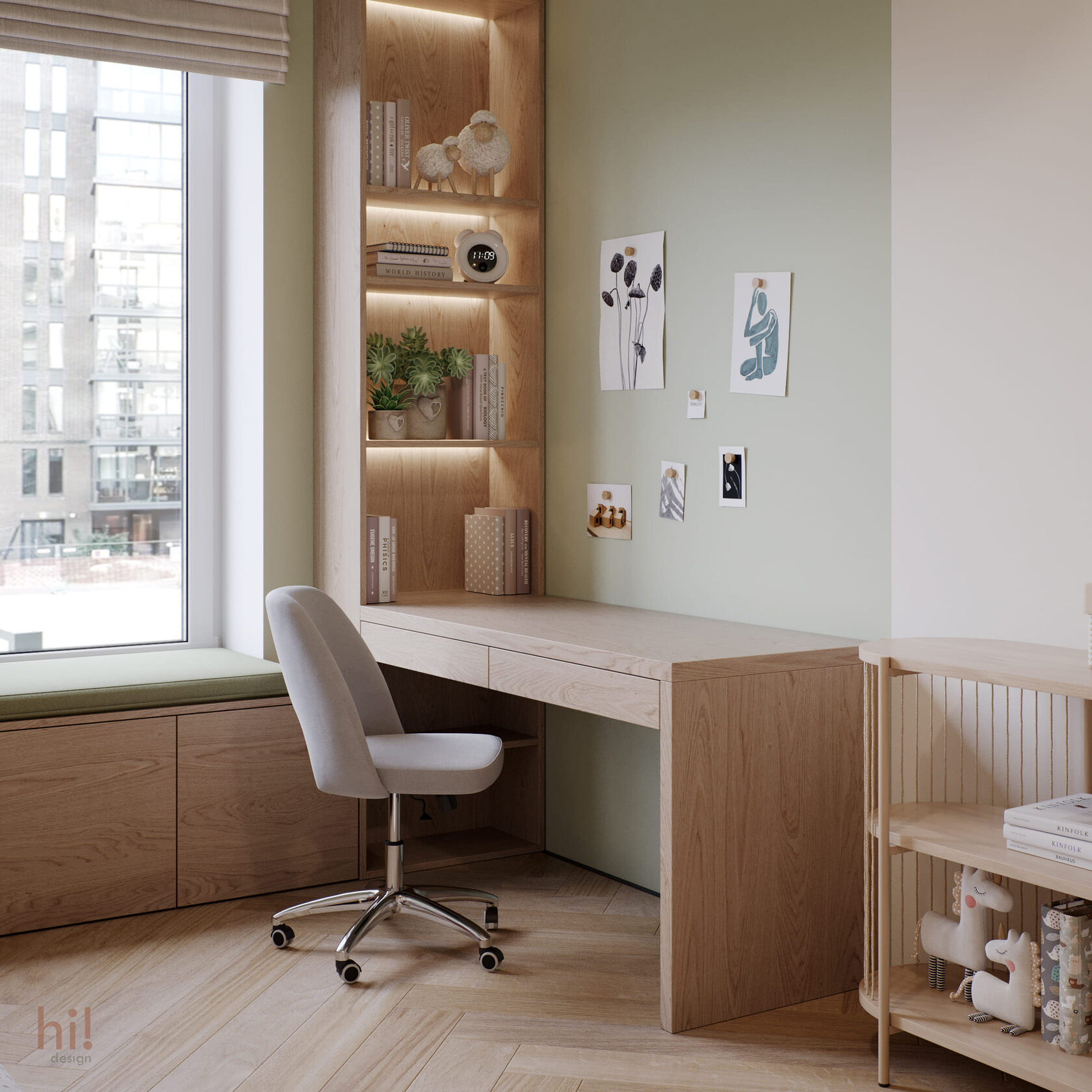 с удаленной работой обоих родителей, а значит красивыми, интегрированными в общий интерьер, рабочими местами. Интересное решение получилось с «парящими» гардеробами в Холле, они огибают очень массивный инженерный короб, скрывают его и обеспечивают вместительное хранение